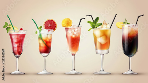 Cocktail glass with colorful liquid drinks on transparent background. Realistic vector illustration set of alcohol beverage glassware mockup for restaurant menu. Goblet with bright aperitif.