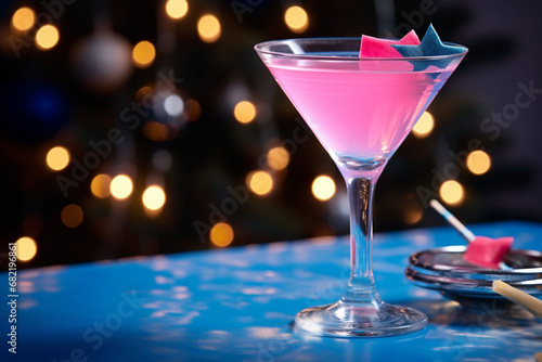 cocktail on white table, christmas tree and lights on background blue and pink, pastel created with Generative Ai