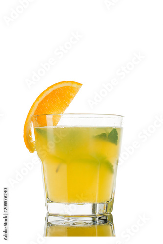 Cocktail. Orange juice, mint and ice decorated with orange. Isolated on white background.