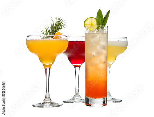 Cocktail tower with three stacked drinks isolated on white.