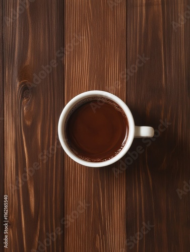Cocoa chocolate cup with hot drink and white marshmallow on wood desk cozy background, cacao in mug on brown wooden rustic table, holiday coffee house shop, above top overhead view, copy space