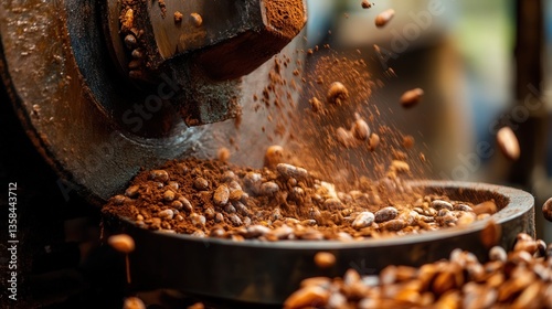cocoa maker in full operation, grinding cocoa beans into chocolate, with the rich color of chocolate emerging from the process.