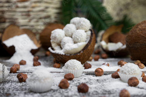 Coconut candy, balls, coconuts and hazelnuts on a rustic wooden surface