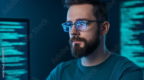 Coder refining code, holographic projections, high-tech workspace, blue tones