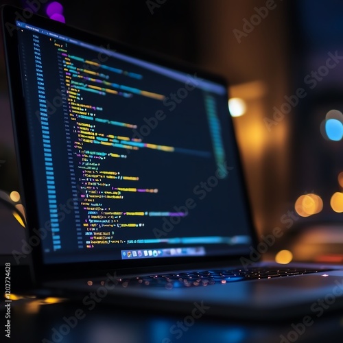 Coding Session on a Laptop With Colorful Syntax Highlighting in a Dimly Lit Workspace at Night