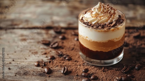 Coffee and cream dessert served in a glass on a rustic table
