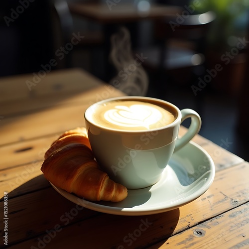 Coffee and Croissant on Wood Table with Latte Art