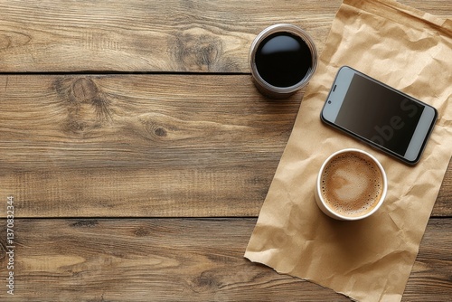 Coffee and Smartphone on Rustic Wooden Table with Brown Paper for a Relaxing Morning Still Life
