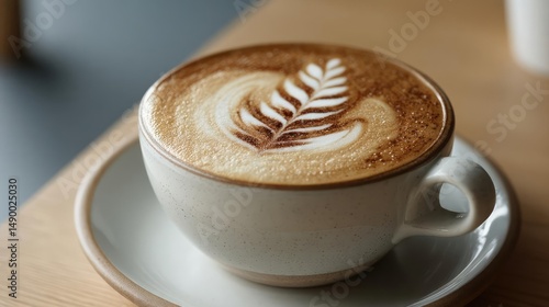 Coffee art latte with latte swirl and milk foam concept. A beautifully crafted coffee with latte art on a wooden table.