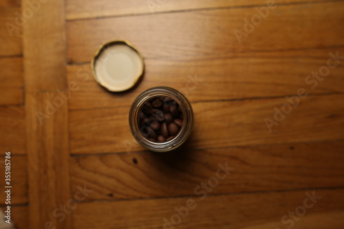 Coffee beans in a jar. Top view. Jar with coffee beans on a wooden background