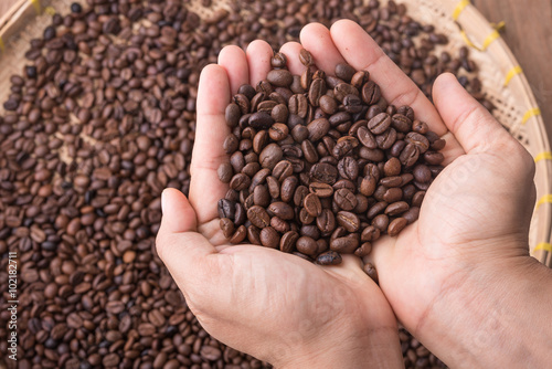 Coffee beans in hand by barista, background is a coffee beans in the bamboo basket