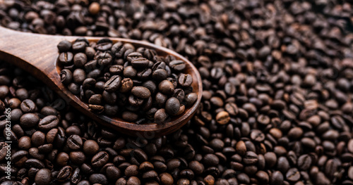 Coffee beans panoramic image, Roasted coffee beans with scoop