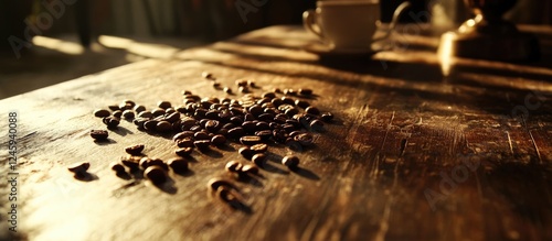 Coffee beans scattered on a rustic wooden table with soft lighting creating a warm and inviting atmosphere for coffee lovers