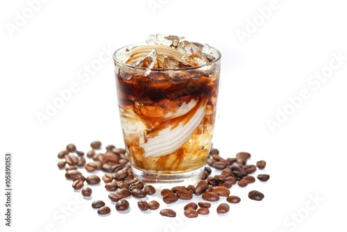 Coffee beans spread around glass menu Americano ice coffee serving with coconut water and coconut slices for topping in white background and isolated beverage concept.