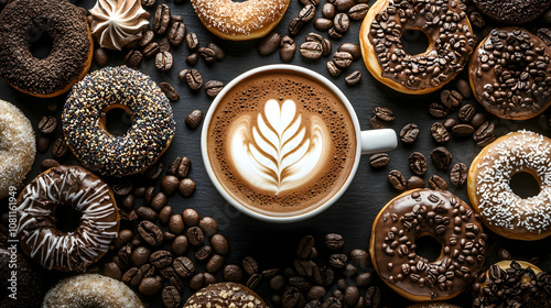 Coffee Break with Donuts and Coffee Beans, latte, cappuccino, doughnuts, chocolate donuts, sprinkles