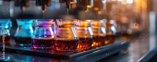 Coffee brewing equipment, vibrant colors, photography, detailed, artisanal