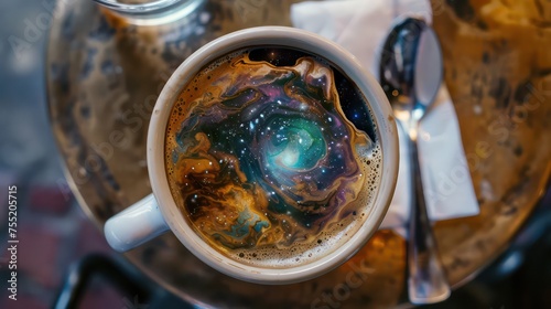coffee cup filled with dark coffee that is mixed with colorful nebula and galaxies inside the cup