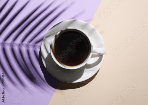 Coffee cup on a pastel background with palm leaf shadow. Creative layout.