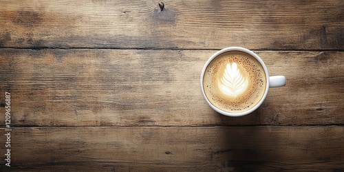 Coffee cup with latte art on a rustic wooden table background soft brown tones warm cozy ambiance top view natural lighting