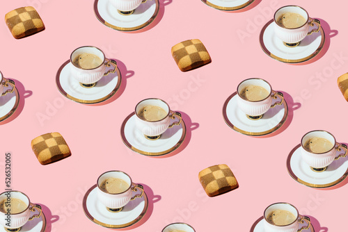 Coffee cups and cookies, creative pattern on pastel pink background.