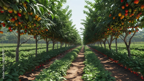 Coffee Farm: Rows of Trees with Shaded Understory and Ripening Fruit, Generative AI