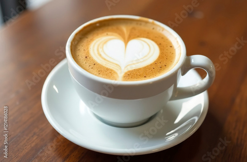 Coffee in a white cup on a saucer, with a heart pattern made of foam, latte art.