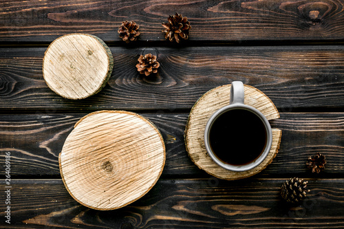 coffee on sawcut and pine cone pattern for blog on wooden background top view