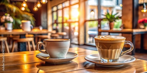 Coffee shop ambiance with a latte and cappuccino on the table next to a newspaper, selective focus