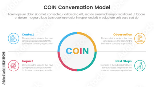 COIN Conversation Model infographic 4 point stage template with big circle center and outline box description for slide presentation