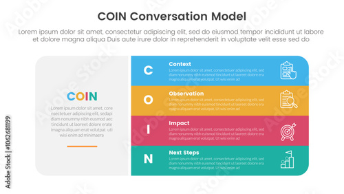 COIN Conversation Model infographic 4 point stage template with big round box and vertical stack point for slide presentation