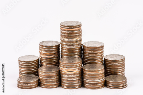 Coin stacks isolated on white background. Saving, Investment money concept. Coin stack growing business.