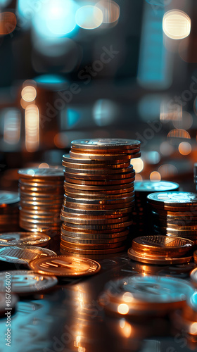 Coins stacked on table, stylized as business concept background for finance and money themes