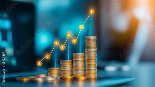 Coins stacked with a glowing growth graph on a desk, representing financial success.