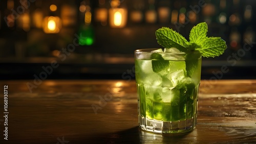 Cold and Refreshing Mint Julep with Fresh Mint Leaves Beautifully Served on the Bar Counter: Inviting Cocktail Experience