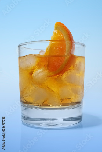 Cold and refreshing orange punch cocktail with orange slice on color background. summer drink.
