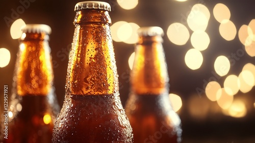 Cold beer bottles with condensation and bokeh lights. Perfect for beverage photography, refreshment themes, and celebration concepts.