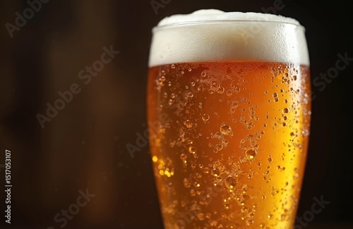 Cold beer glass with froth, bubbles, closeup. Light golden beverage. Frothy liquid with condensation, perfect for pub bar menu, Oktoberfest celebration. Refreshing alcoholic drink with bubbles