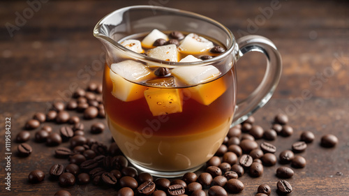 Cold brew coffee cocktail served in a pitcher with coffee beans on the table