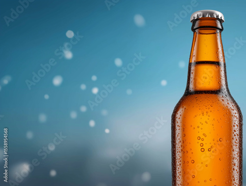 Cold Brew Delight: A refreshing amber beer bottle glistens with condensation against a serene blue backdrop, inviting a moment of cool enjoyment.
