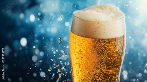 Cold glass of beer with frothy head against blue background, splashes and droplets in clear focus. Refreshing beverage and relaxation concept