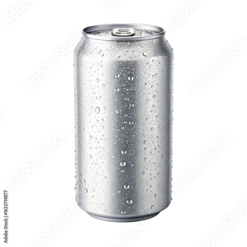 Cold refreshing aluminum beverage can with water droplets isolated on transparent background