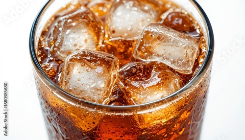 Cold refreshing soda drink with ice cubes in transparent glass, fizzy sweet beverage, chilled summer refreshment, sparkling carbonated drink