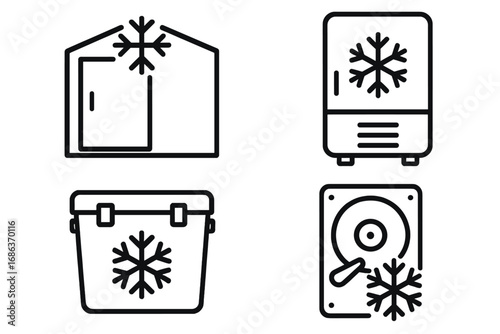 Cold storage icon set vector. Outline icons for freezer, warehouse, cooler and crypto hard drive. Data archiving and food refrigeration concept illustration for web and apps.