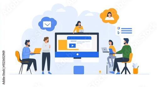 Collaboration event among professionals in a virtual workspace online meeting digital illustration modern environment aerial view