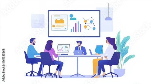 Collaborative business meeting with data analysis and strategic planning visualized