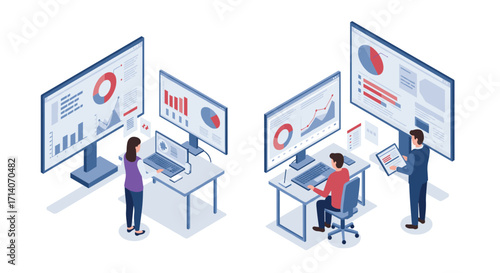 Collaborative data analysis in isometric office with multiple screens and diverse team