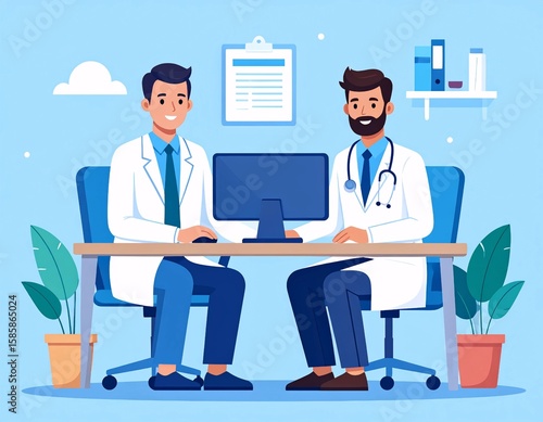 Collaborative Doctors: Smiling Physicians in Modern Clinic Using Computer, Flat Design Illustration