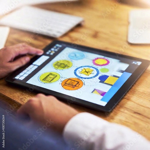 Collaborative Drawing on a Tablet: Soft focus, studio shot highlighting creative teamwork by focusing on a tablet with a collaborative digital drawing in progress.