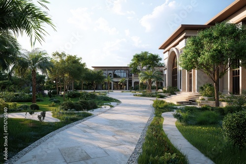 Collaborative learning space in a private luxury villa outdoor garden path enriching environment serene viewpoint creative concept
