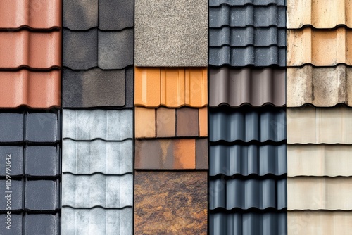 Collage displaying various roof coverings showcasing styles and textures for residential and commercial buildings. Generative AI